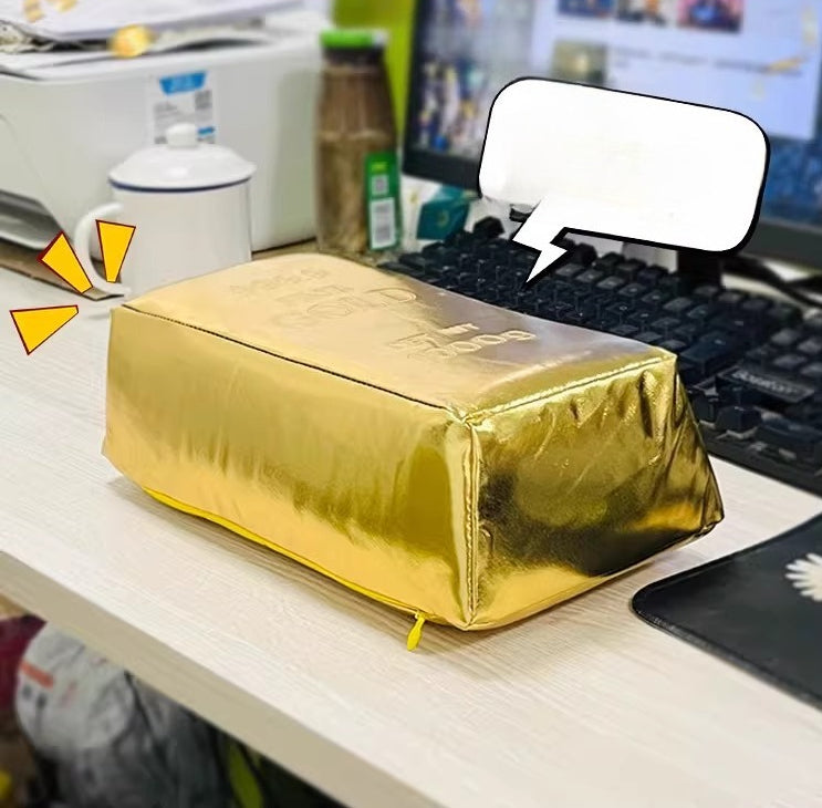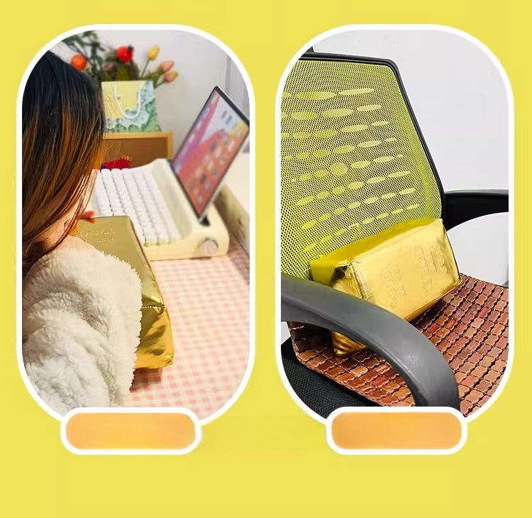 • This shiny plush pillow brings a touch of luxury to your daily break. Designed to look like a massive bar of gold, it offers firm support for your head or back while adding a humorous "wealthy" vibe to your workspace.