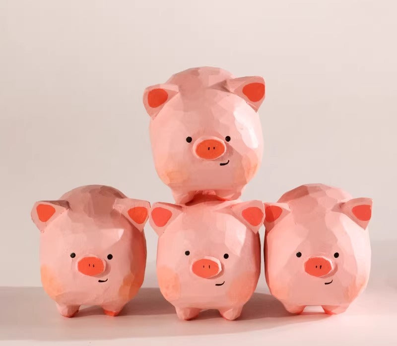 Hand-Carved Wooden Pig Figurine Set