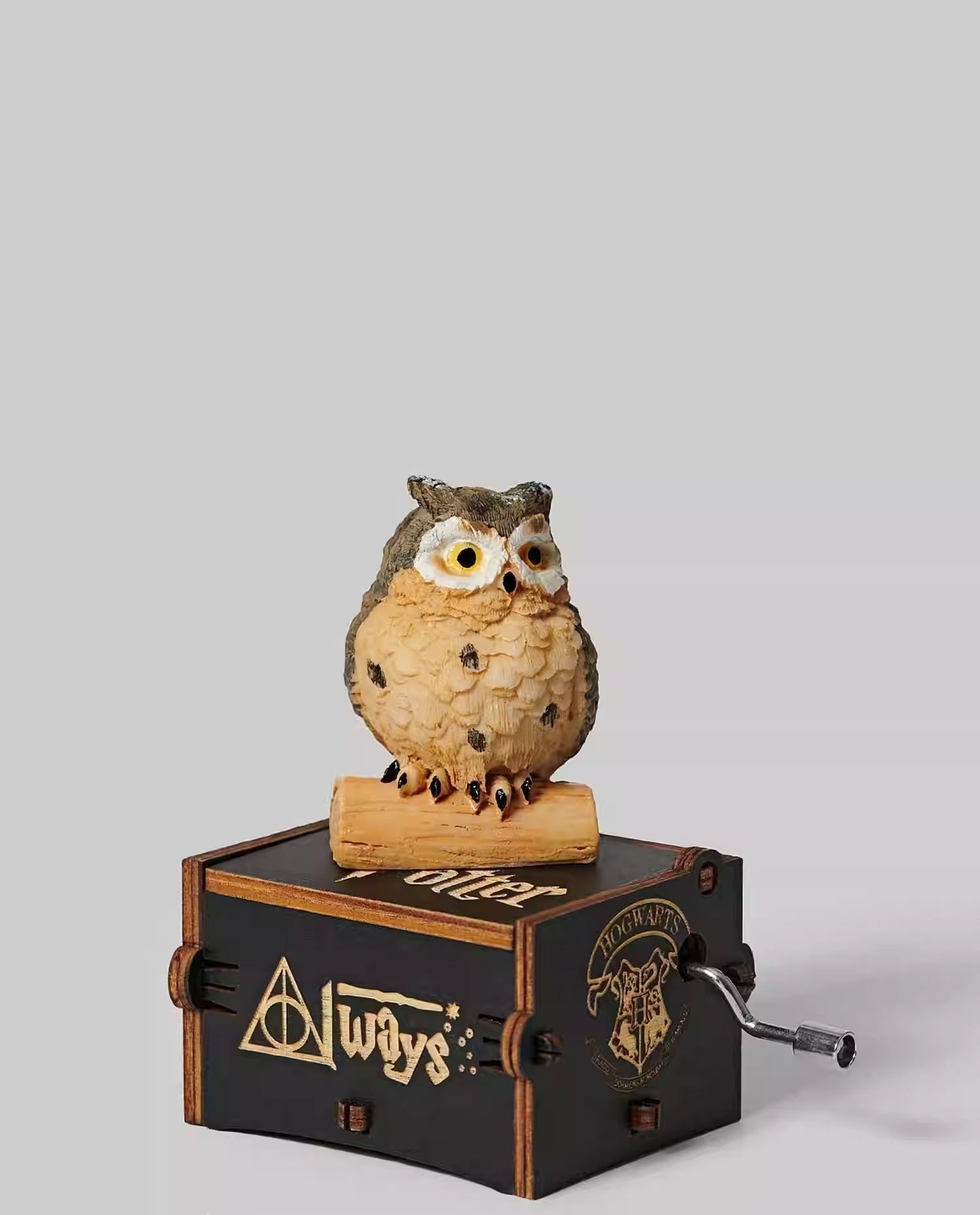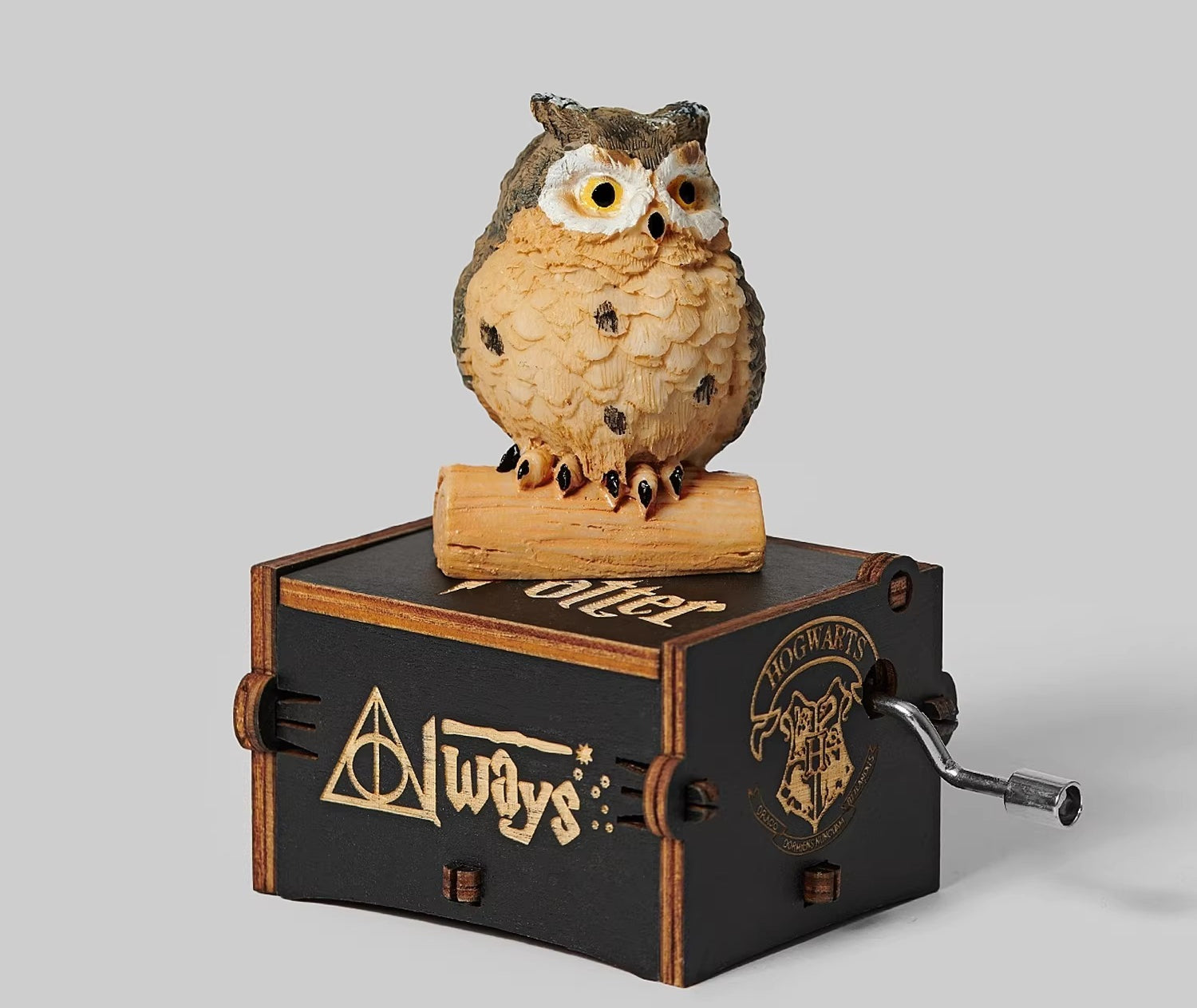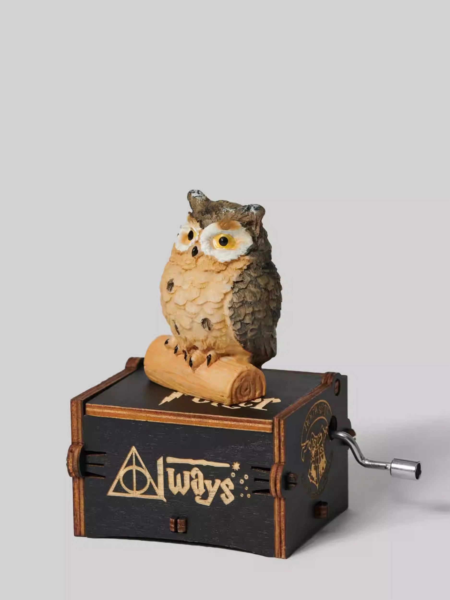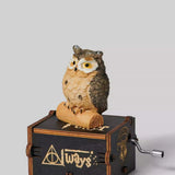 A compact, hand-cranked wooden music box featuring a detailed owl figure perched on top, playing a classic familiar melody.