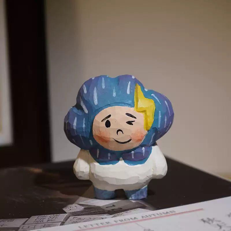 This whimsical wooden figure features a playful character wearing a storm cloud as a hood, complete with painted raindrops and a lightning bolt. Hand-carved from linden wood, its winking expression adds a cheerful personality to any desk or shelf.