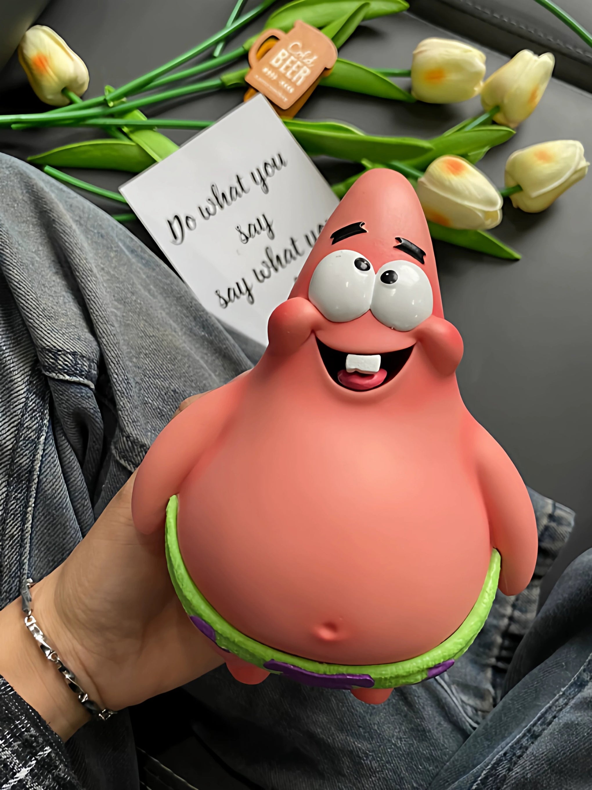 This small Patrick Star figurine comes dressed in a cozy knitted hat and scarf, adding a humorous and seasonal touch to any shelf or desk. It is a simple, lighthearted gift for fans of the character who appreciate unique collectible styles.