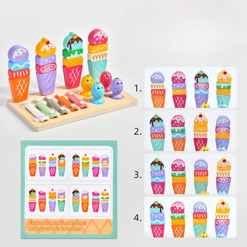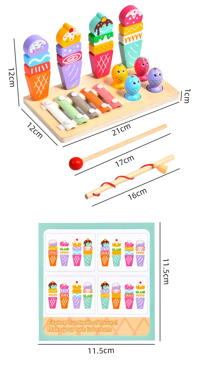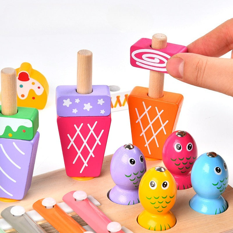 Ever wished you could combine the peace of a puzzle with the creative chaos of a music lesson? This clever little wooden station does just that. It’s a stacking puzzle, a pretend ice cream shop, a fishing game, and a xylophone all rolled into one sturdy base—perfect for keeping tiny hands busy while you manage to drink a hot cup of tea.
