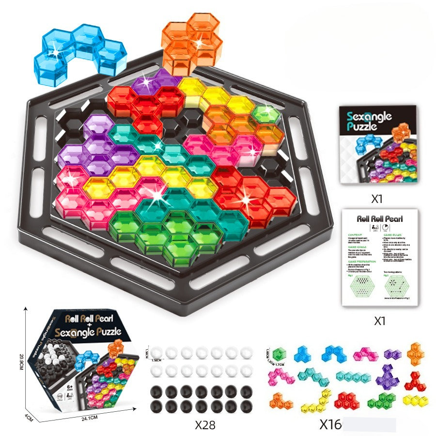 • 16 x Hexagonal Puzzle Blocks: Translucent, jewel-like colours (Red, Blue, Green, Yellow).