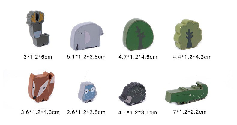 • The Animals: 10 x Wooden figures (Giraffe, Lion, Elephant, Hippo, Crocodile, Fox, Sheep, Hedgehog, Owl, Moose).