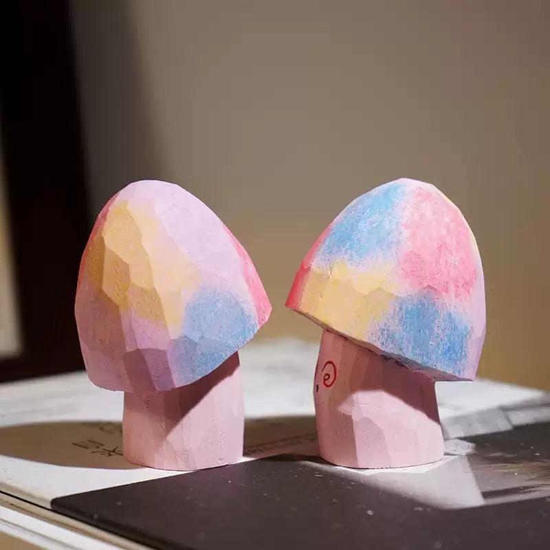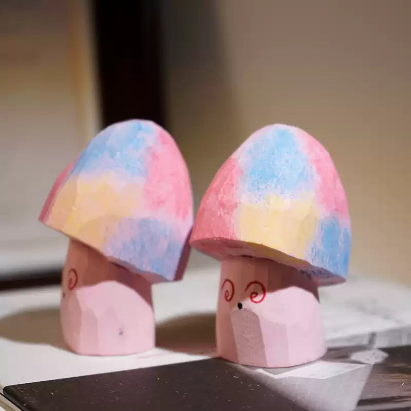 With its soft pastel cap and swirly red eyes, this wooden mushroom has a wonderfully dazed expression. Hand-carved from linden wood, its faceted surface and colorful paintwork make it a quirky addition to any collection.