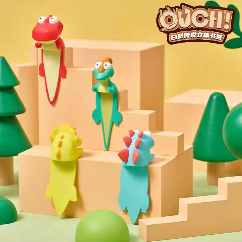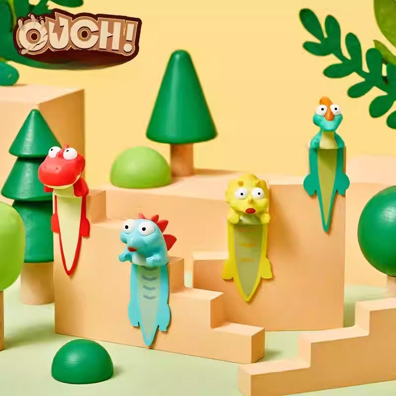 A flexible 3D bookmark featuring detailed dinosaur designs that pop out from the top of your book, making it easy to find your place with a touch of character.