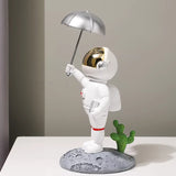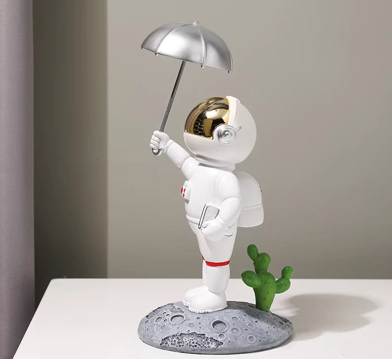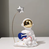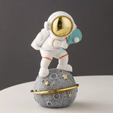 Bringing a playful touch to modern decor, this figurine depicts an astronaut character engaged in various activities atop a textured moon base. It serves as a charming accent piece for a study, living room, or personal workspace.