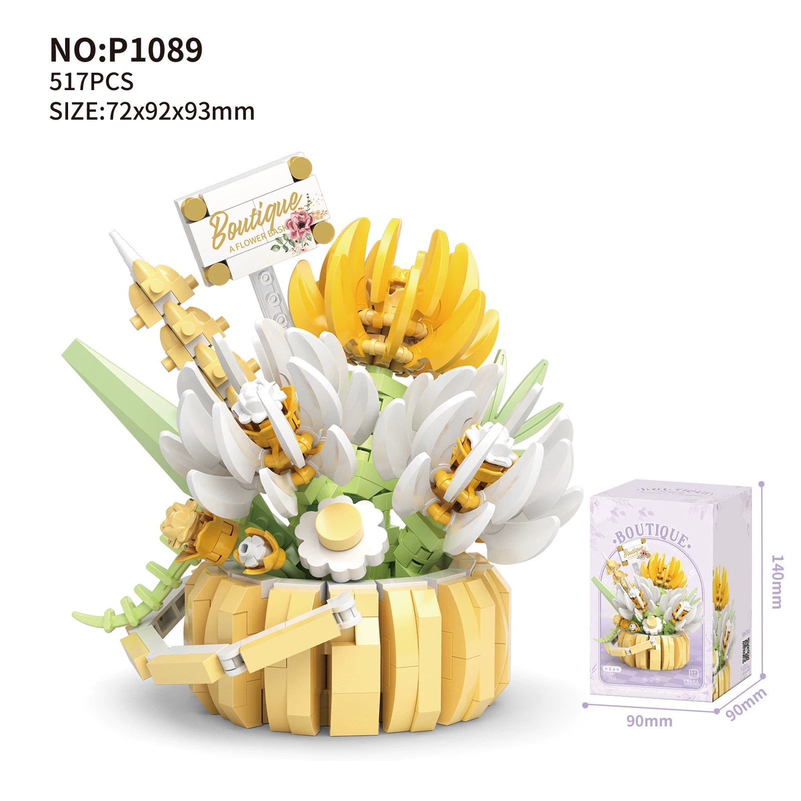 Features a variety of floral designs including sunflowers, roses, and tulips arranged in a brick-built basket.